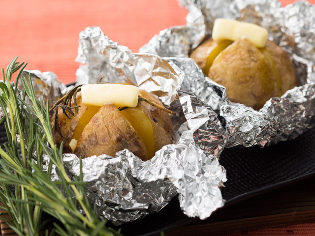 - ジャガイモにローズマリーを巻きつけ、アルミホイルでぴっちりと包む。